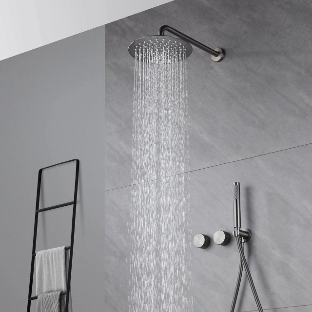 This shower system is ideal for anyone seeking a hassle-free yet luxurious bathroom upgrade. Its sleek gun gray finish makes it a versatile addition to both modern and classic interiors, creating an understated elegance. The round showerhead design ensures even water distribution, providing a spa-like experience in your home. Best used in master bathrooms, guest suites, or any space where style and performance are paramount, it brings effortless sophistication to your daily rituals.